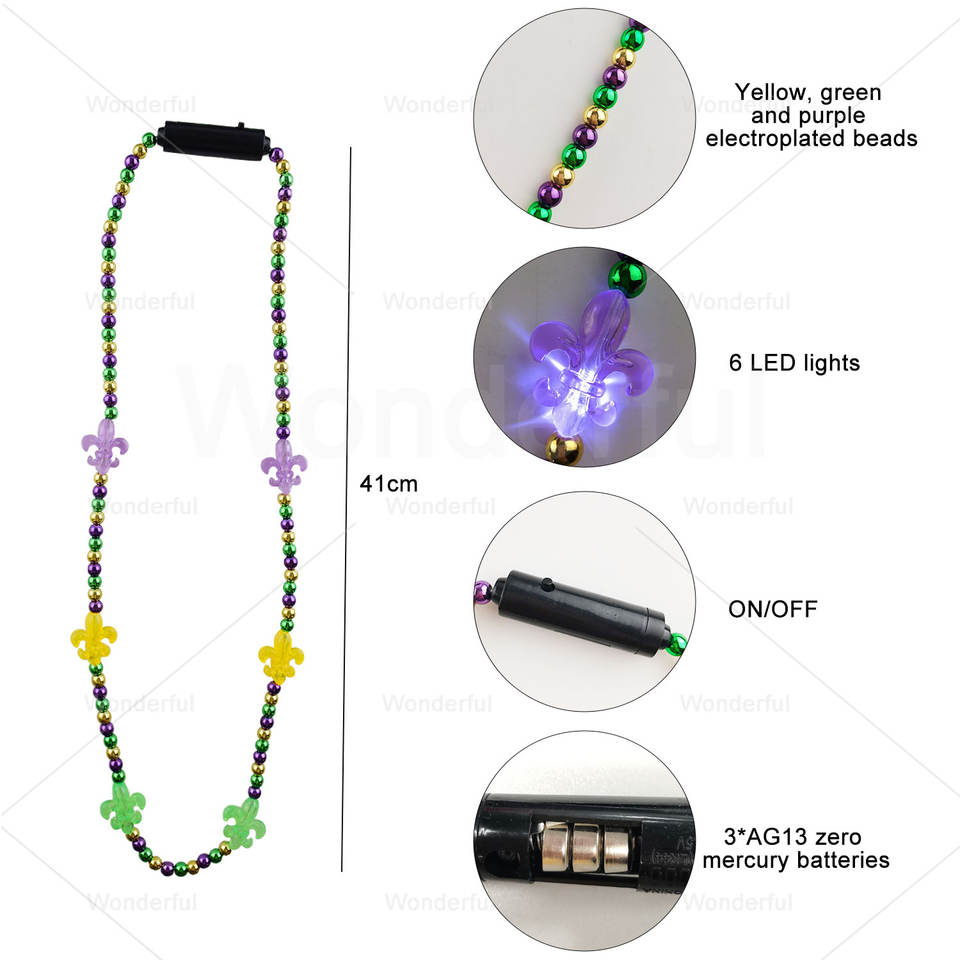 Classica Collana di Perline Mardi Gras con Luci LED Viola, Verdi e Dorate per Decorazioni e Accessori Natalizi, di Capodanno e Matrimoniali