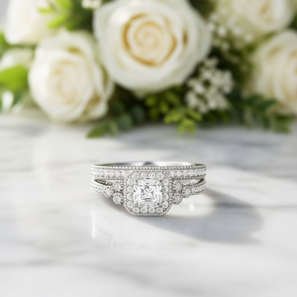 Anello di fidanzamento classico con diamante naturale taglio Princess colore D, in oro bianco e rame con alone di diamanti laterali, da donna T0336