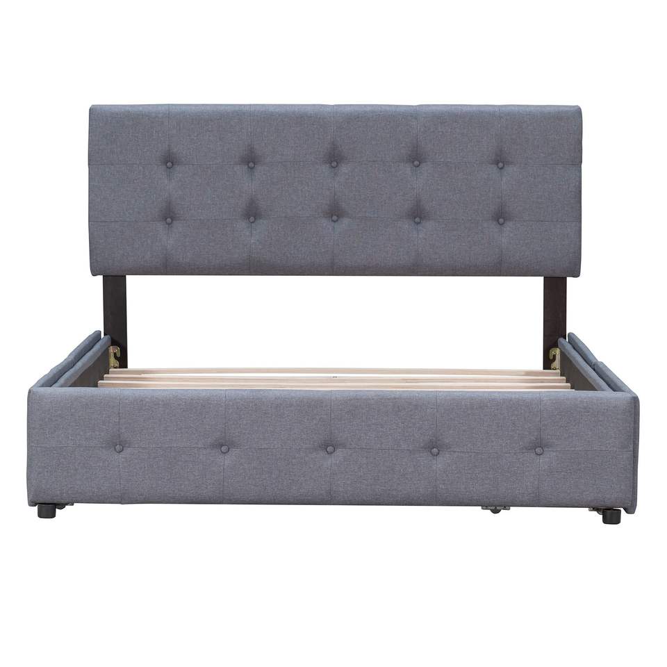 Letto Classico Queen-Size Grigio Scuro Imbottito con Piattaforma in Tessuto di Lino, 4 Cassetti, Non Richiede Rete a Doghe, con Elegante Testiera