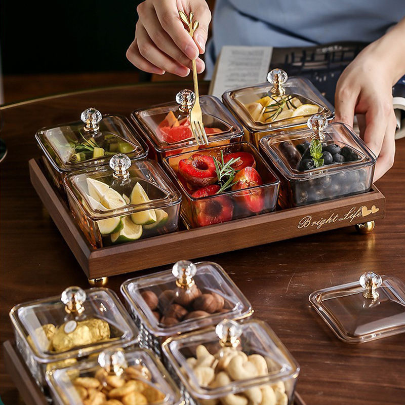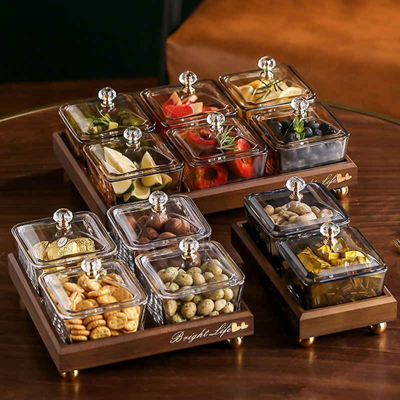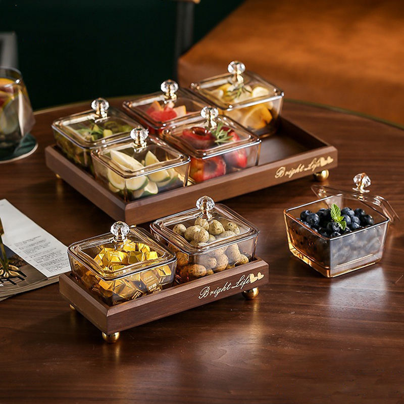 Piatto di frutta secca in vetro stile classico con coperchio vassoio Snack eco-friendly per alberghi personalizzabili modello di servire vassoi