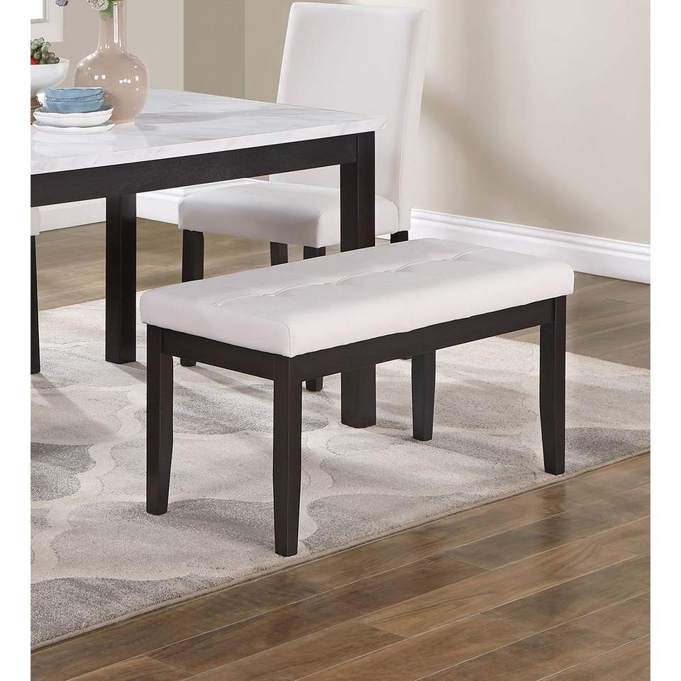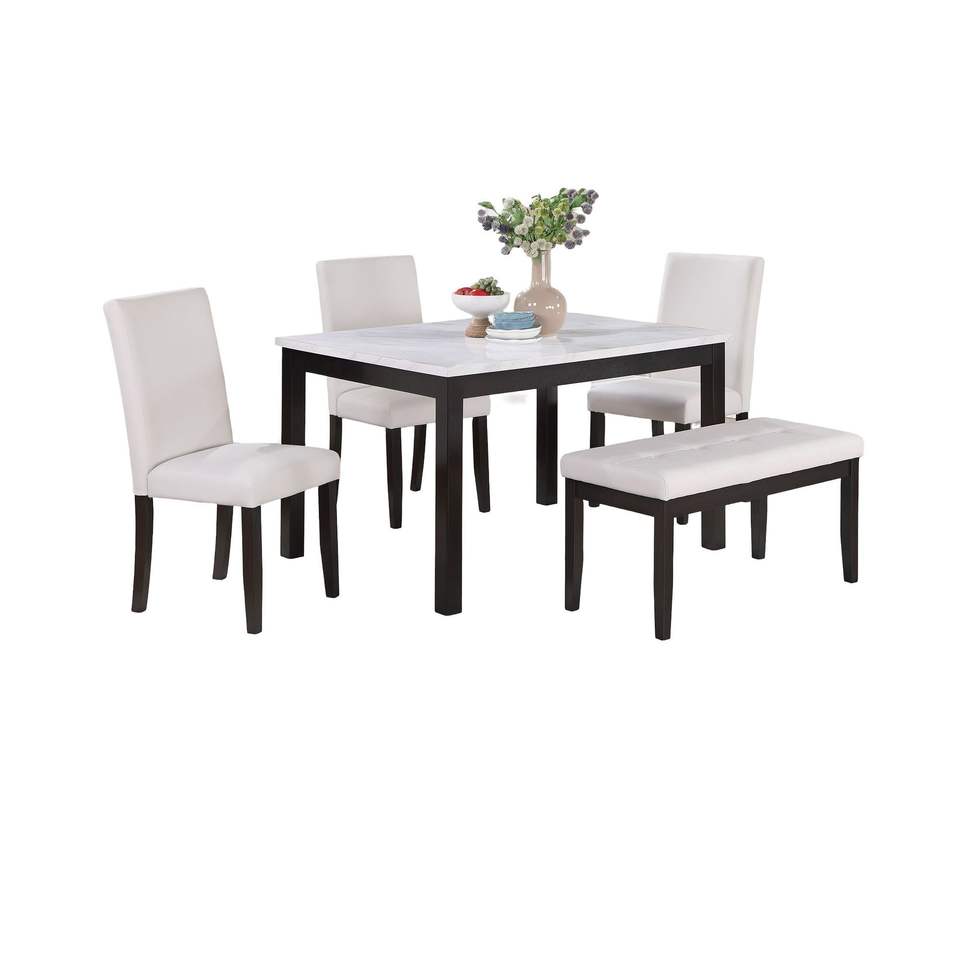 Set da Pranzo Classico ed Elegante 5 Pezzi con Piano in Finto Marmo, Tavolo da Cucina, Panca e 3 Sedute in Ecopelle Bianca