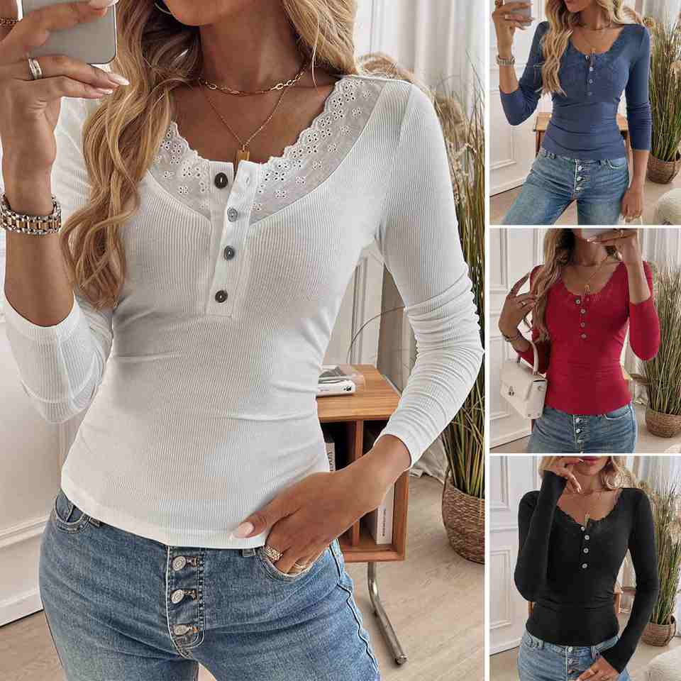 Maglioni Classici Personalizzati, Outfit Estivi, Moda Y2K, Elegante Camicia a Maniche Lunghe in Maglia con Bordo in Pizzo per Donne