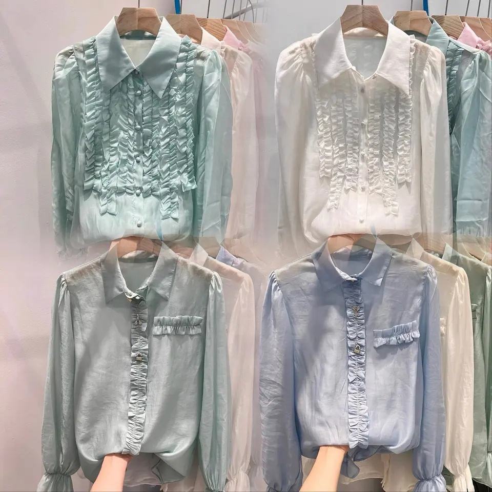 Blusa classica da donna in Chiffon abbottonata a maniche lunghe con piume di pizzo ricamate top Casual da lavoro da ufficio per l'estate