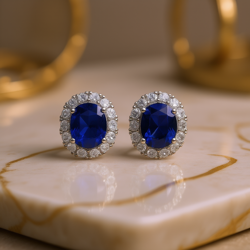Classic Women's Oval Sapphire Stud Earrings With Round Brilliant Cut Diamond Halo Wedding Jewelry Claw Setting