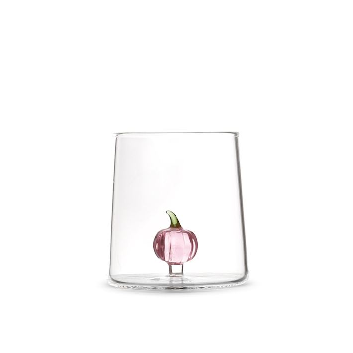 Bicchiere in Vetro Borosilicato Trasparente con Mini Decorazione a Zucca Rosa