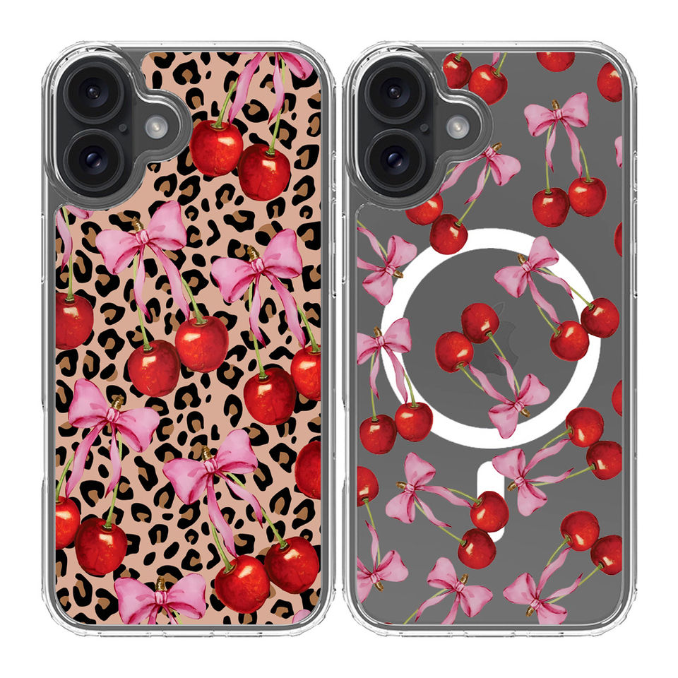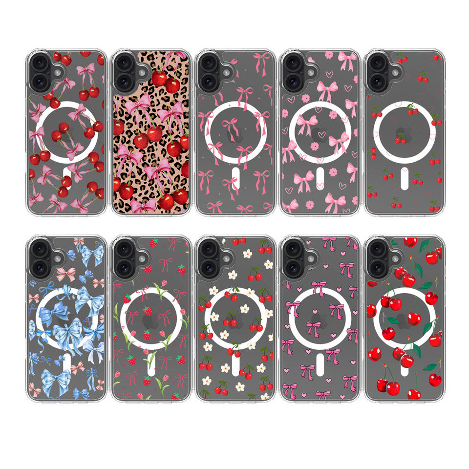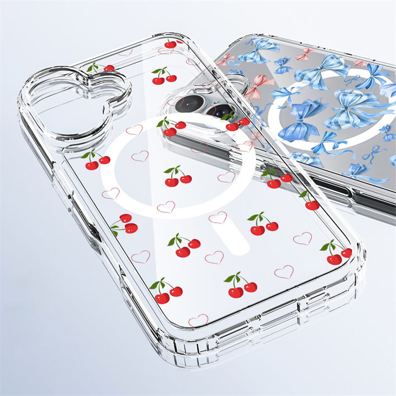 Shenzhen Qinhe Industrial Co., Ltd. – Custodia trasparente magnetica con fiocco cherry e stampa leopardata per iPhone 16 Plus, TPU+PC 1,5 mm, 1 pz