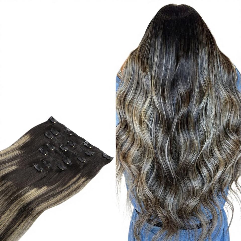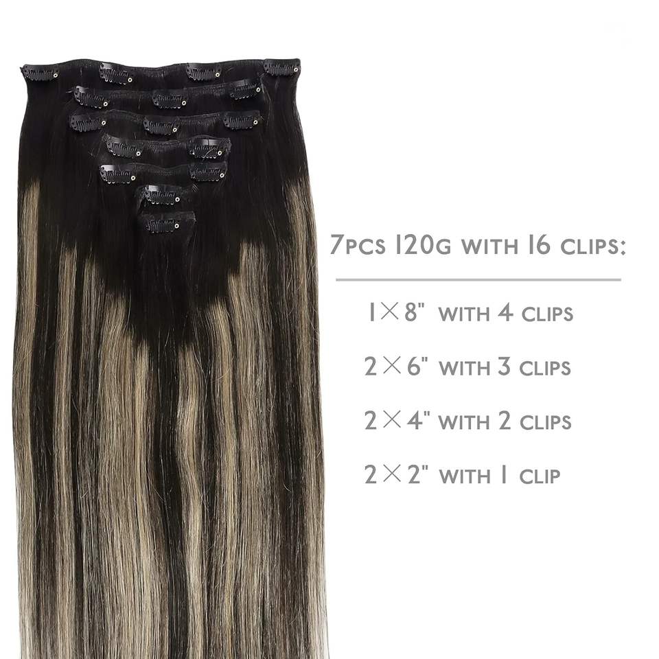 Extensioni di Capelli Umani con Clip 16 Pollici 120g 7 Pezzi Balayage Nero Naturale Biondo Chiaro Remy Doppia Trama Capelli Veri