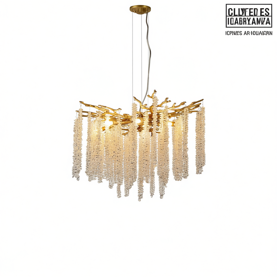 Lampadario a sospensione Clived Es Icabryamza da 24 pollici in ferro dorato con filamenti di cristallo a cascata per soggiorno