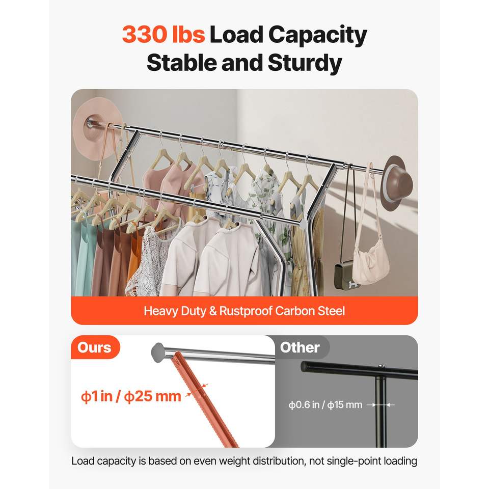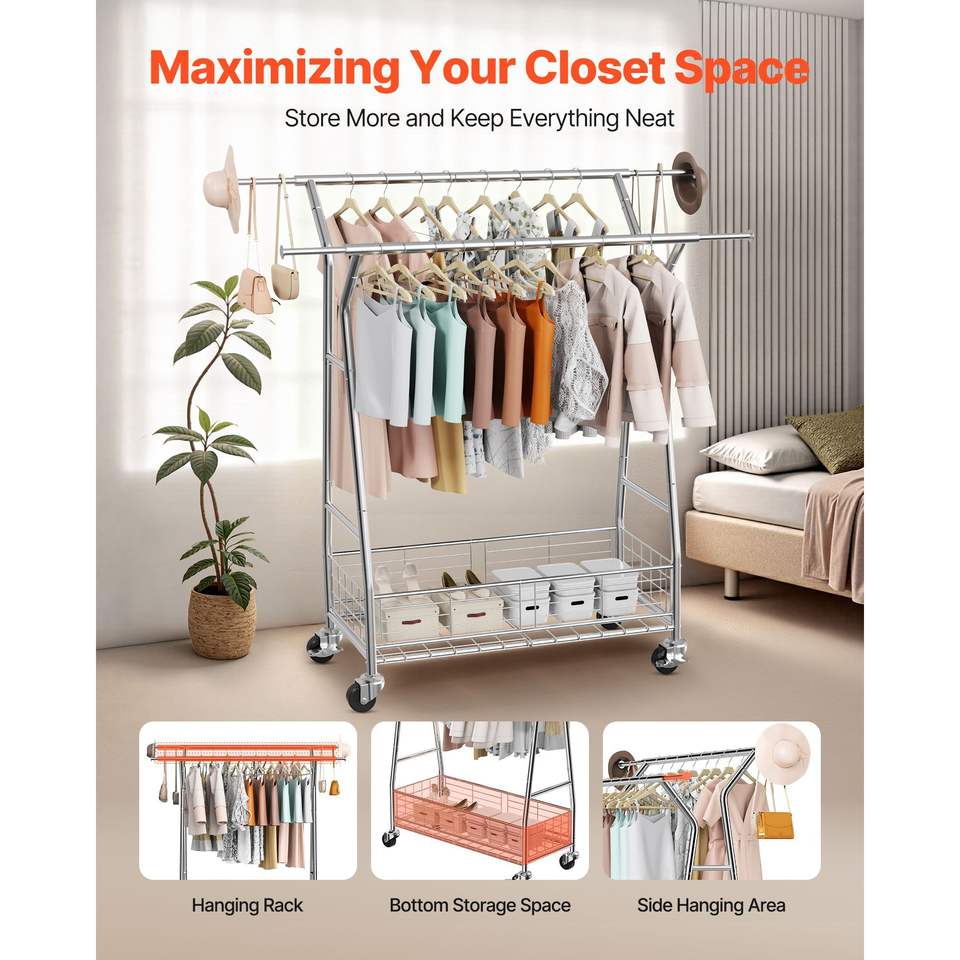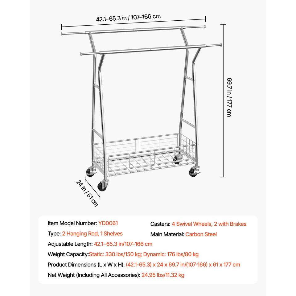 Appendiabiti su Ruote con 2 Aste Appendiabiti, Cesto Portaoggetti, Capacità di Carico 150 Kg, Estensibile in Acciaio al Carbonio