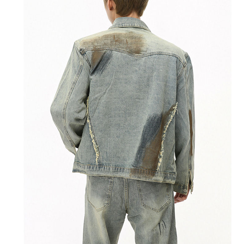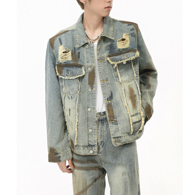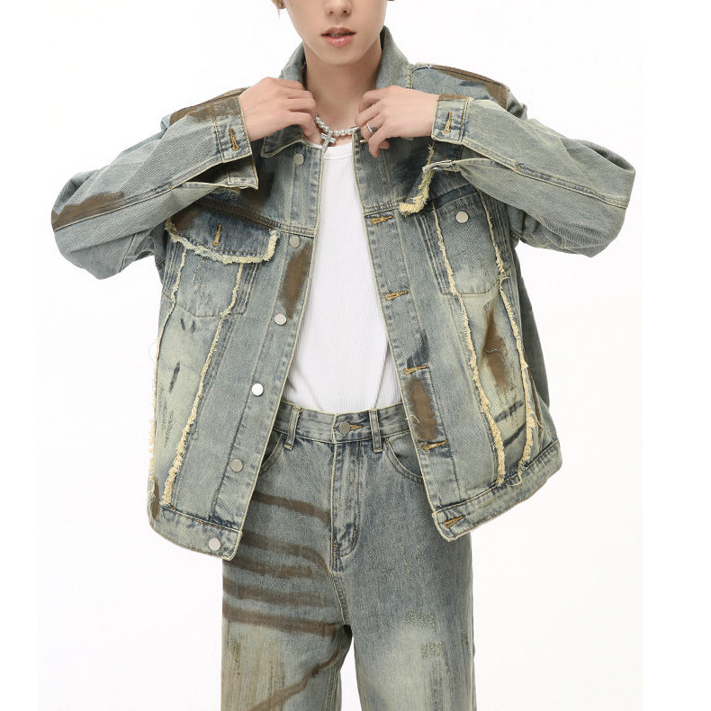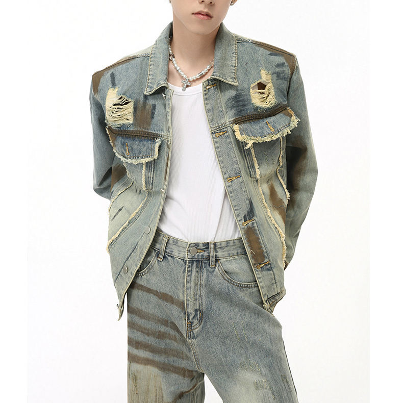 Clothing Factory Casual Street Denim Set Men Two Piece Button up Patchwork Denim Jackets and Jeans Pants Set