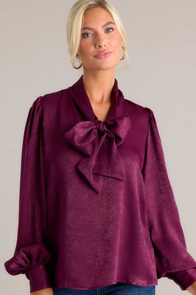 Abbigliamento fabbrica Oem personalizzazione collo a fiocco maniche lunghe bordeaux raso di alta qualità camicetta da donna top