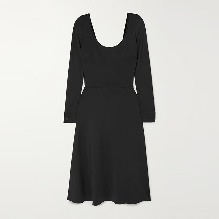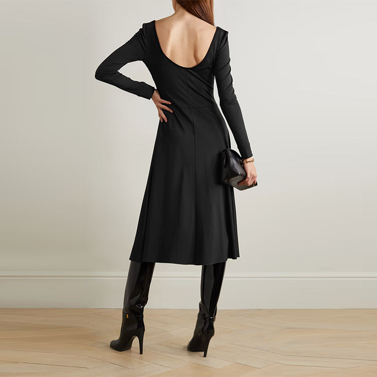 Produttore di abbigliamento personalizzato primavera autunno scollo a V manica lunga aperta posteriore elegante abito nero casual da donna midi
