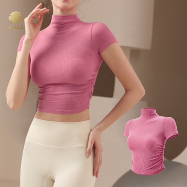 Cnshell Turtleneck Summer Cool Feel Crop Tops Sporty Push up Waist 2 Side Drawstring Soft Rib Short Sleeve High Collar T Shirt