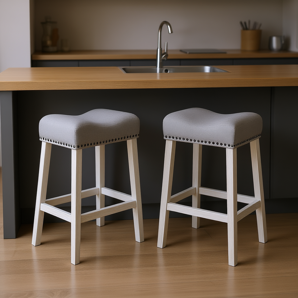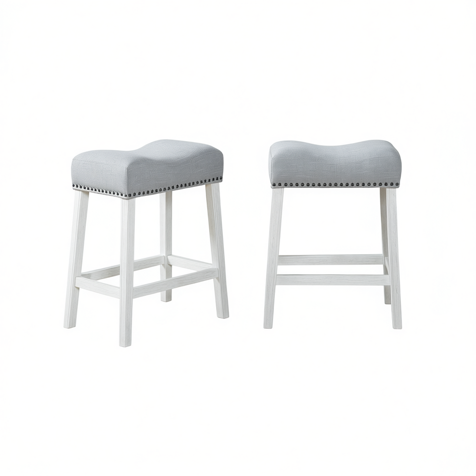 Sgabelli da Bar CoCo con Seduta Imbottita, Struttura in Legno Bianco Decapato, Seduta in Tessuto Grigio, Design Moderno