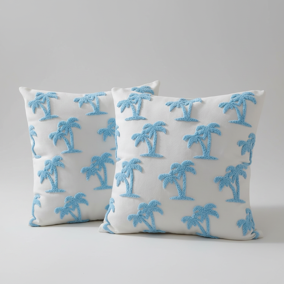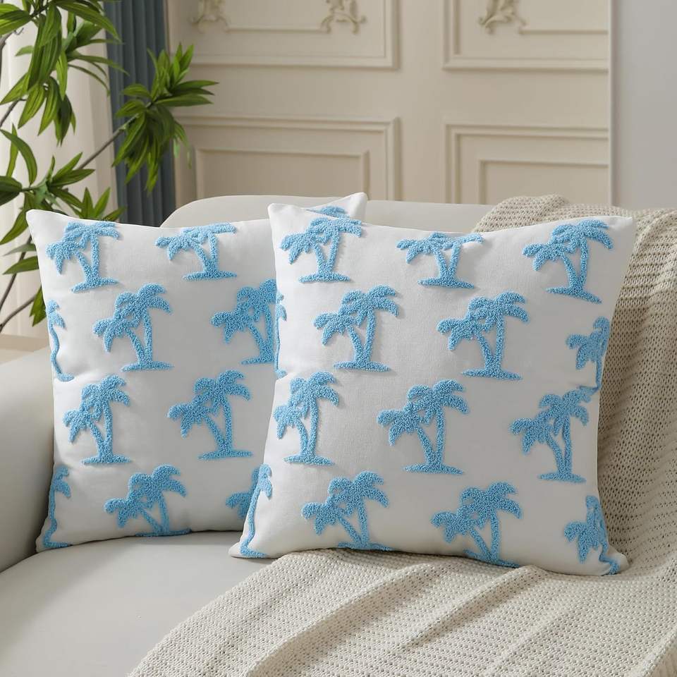 Fodere per cuscini decorativi ricamate stile Hampton blu costiero, 18x18 pollici, set da 2, con alberi di cocco, per divano