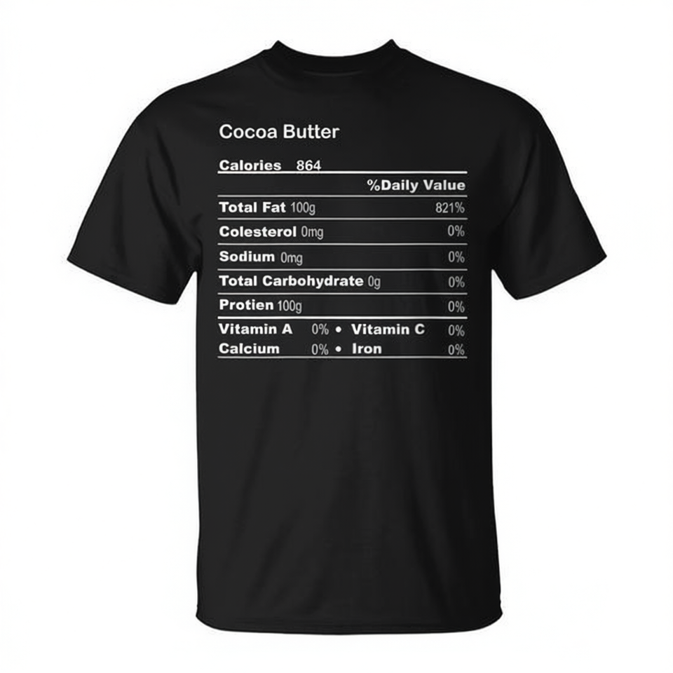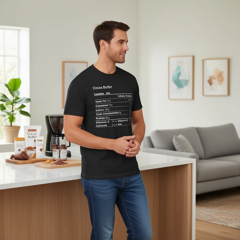 T-shirt con informazioni nutrizionali sul burro di cacao, maglietta promozionale nera da uomo