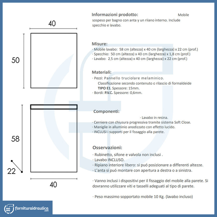 Mobile Bagno Sospeso Compatto Cody 58x40x22cm Laccato Bianco da Assemblare