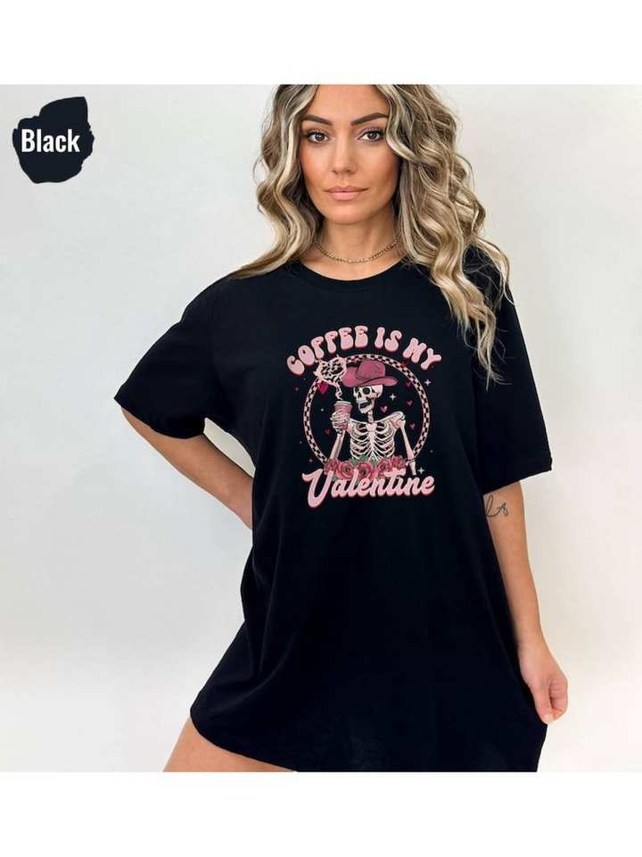 T-shirt sardonica da donna in cotone a maniche corte con scollo rotondo e vestibilità ampia, con stampa 'Coffee Is My Valentine', ideale come regalo per gli amanti del caffè e per outfit di San Valentino.