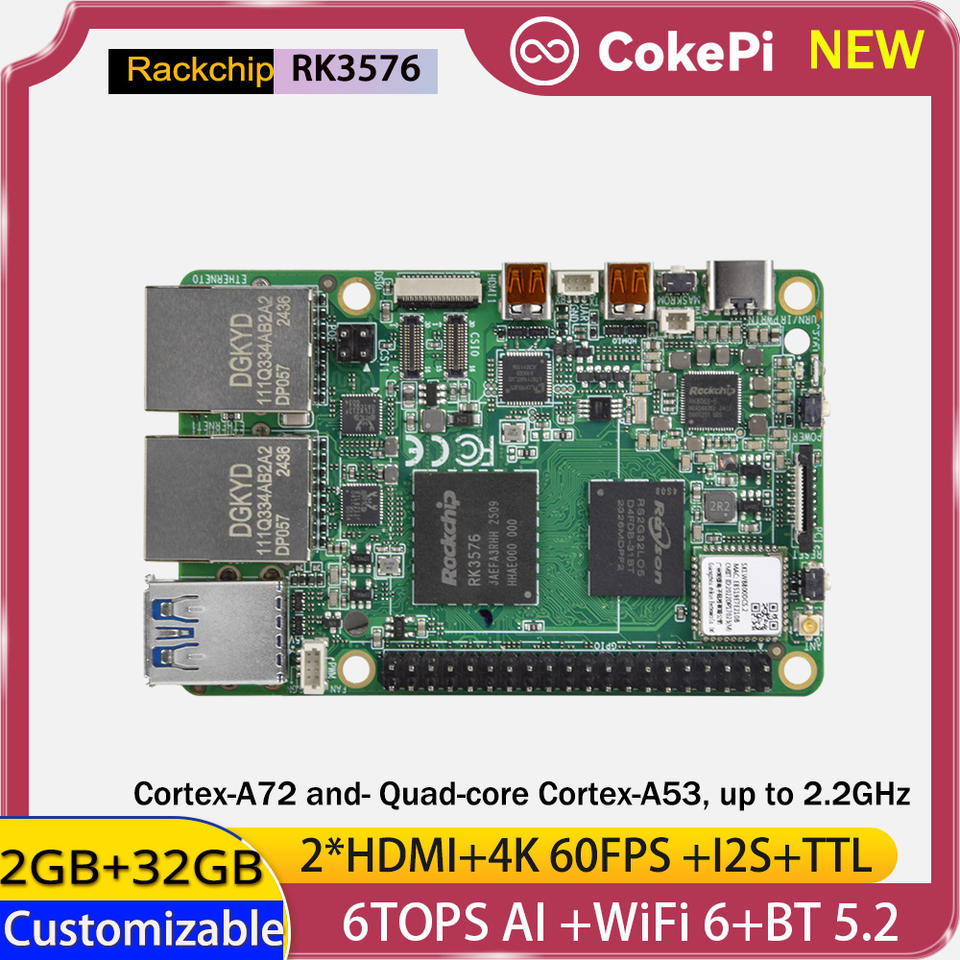 Scheda di Sviluppo AI CokePi Octa-core RK3576 con NPU da 6 TOPS, TTL, I2S, Doppia Ethernet Gigabit, Decodifica 4K, Versione Android 14 KTV