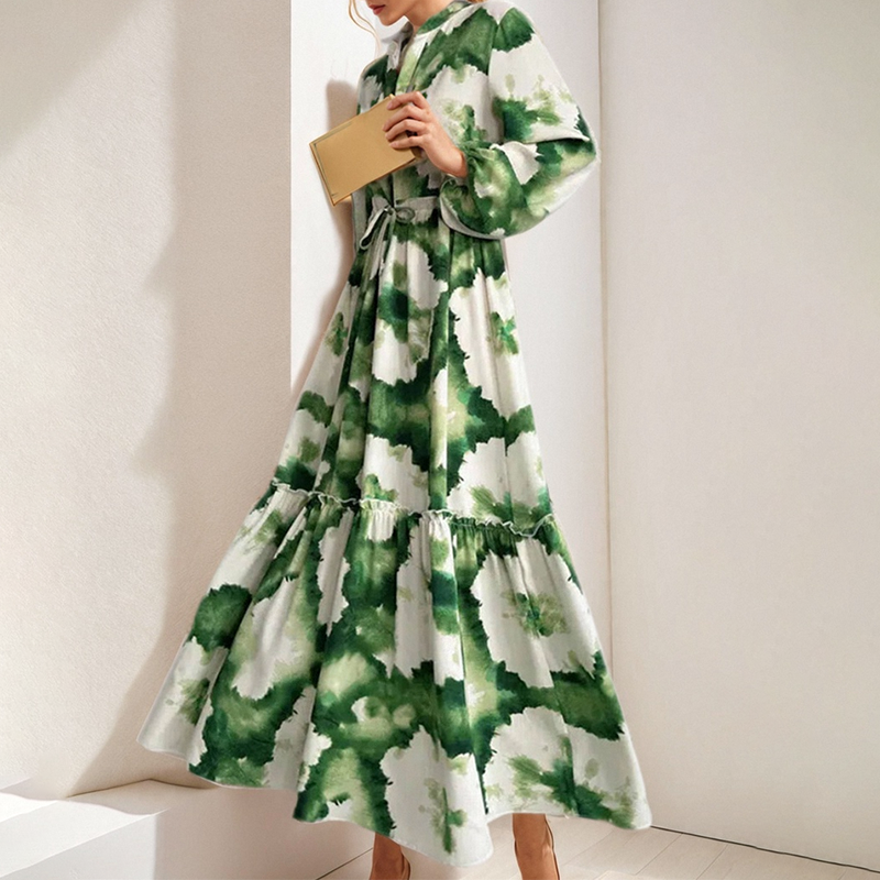 Abiti Lunghi Stampati a Colori per Donna, Nuova Moda Primavera-Autunno, Scollo a V, Maniche Lunghe, Volant e Spacco, Vestito Elegante da Ufficio