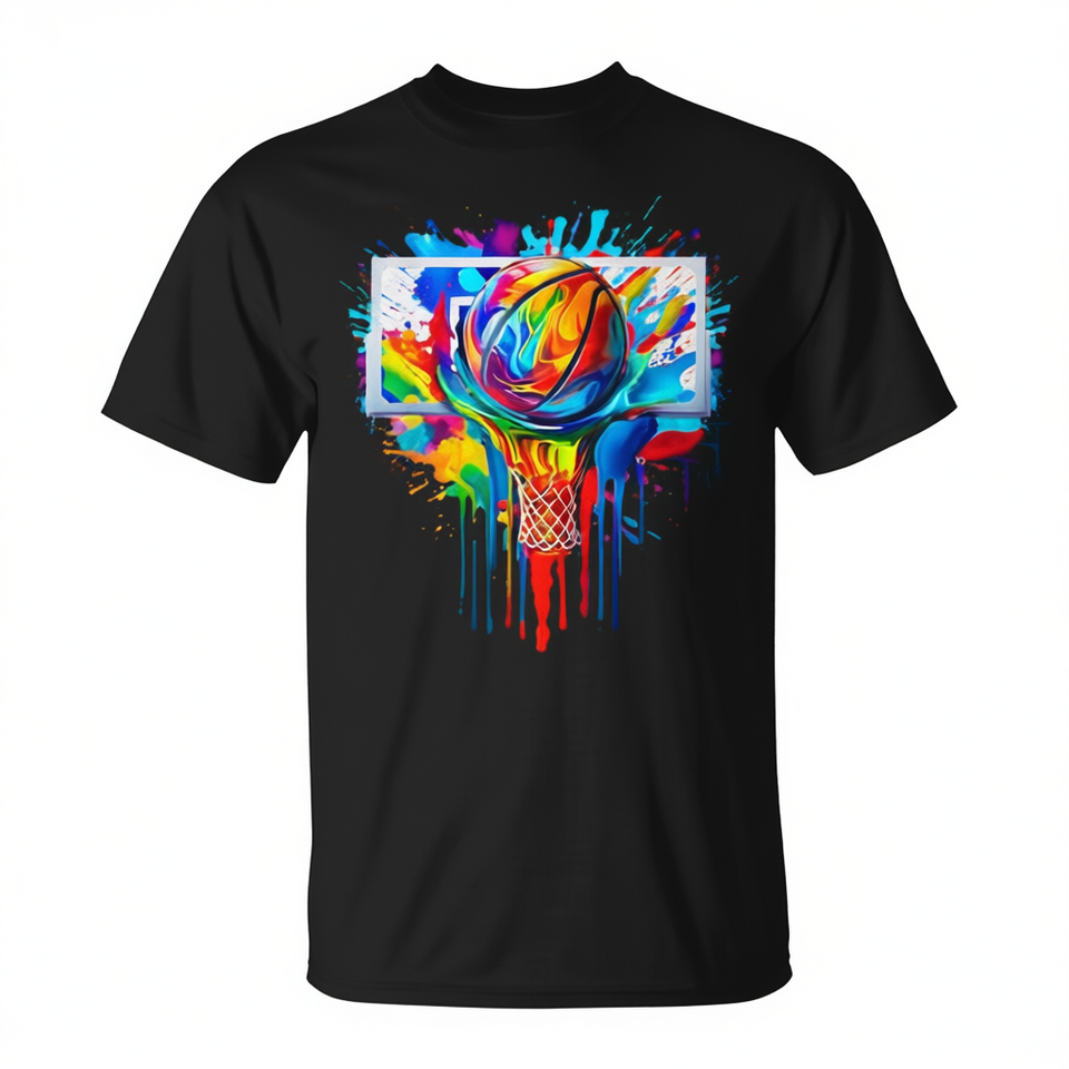 T-Shirt Promozionale Colorata con Stampa Tie-Dye a Tema Pallacanestro e Canestro da Basket