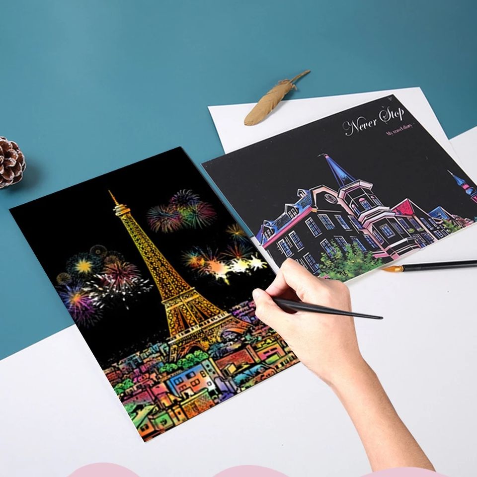Carta magica variopinta del tavolo da disegno della carta del graffio di vista notturna della città della costruzione di arte fatta a mano di DIY della pittura di raschiatura magica
