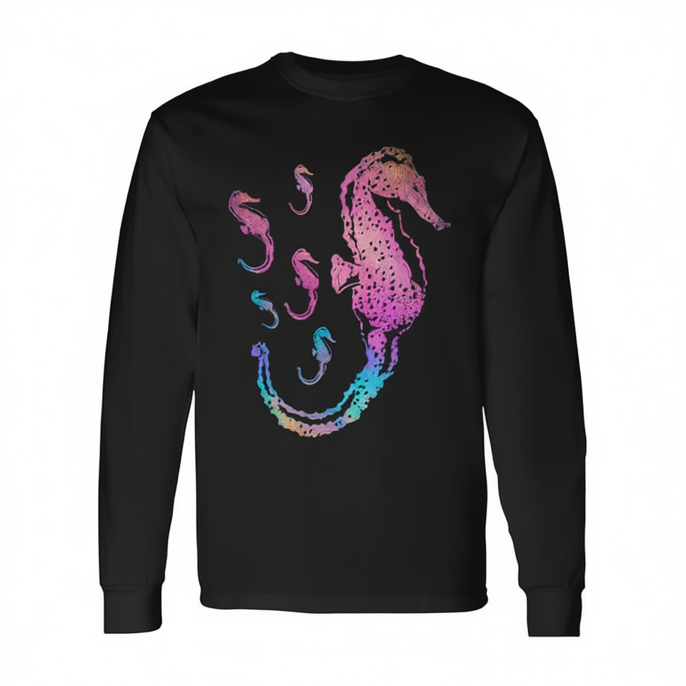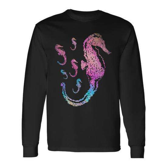 T-shirt a maniche lunghe con cavalluccio marino colorato, design animale marino, tema acquario subacqueo