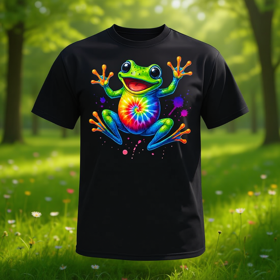 T-shirt colorata con motivo tie-dye a forma di rana, stile retrò, con simbolo della pace, carina