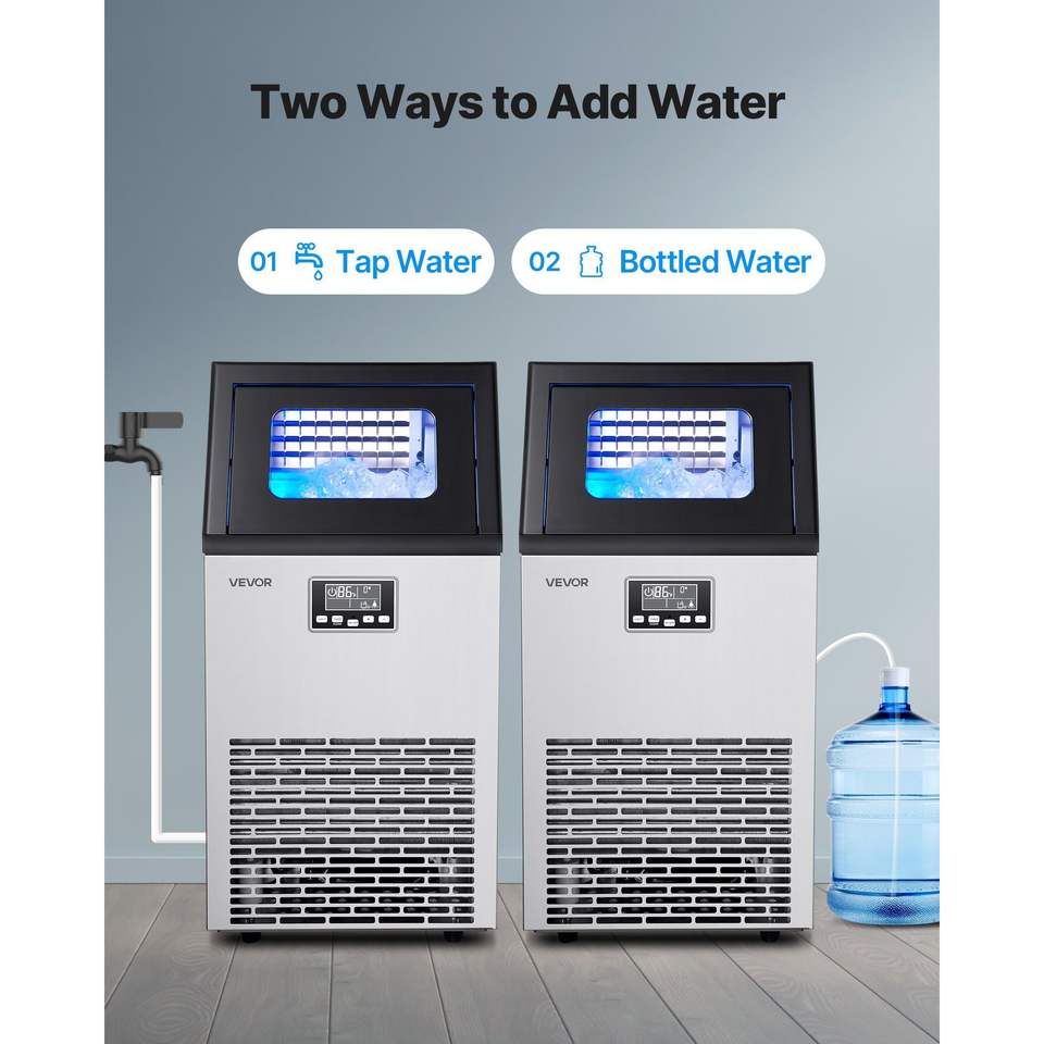 Macchina per il Ghiaccio Commerciale da 120 Libbre/24h, Capacità di Stoccaggio 28 Libbre, 45 Cubetti per Ciclo, Dispenser per Bevande Autoportante in Acciaio Inox
