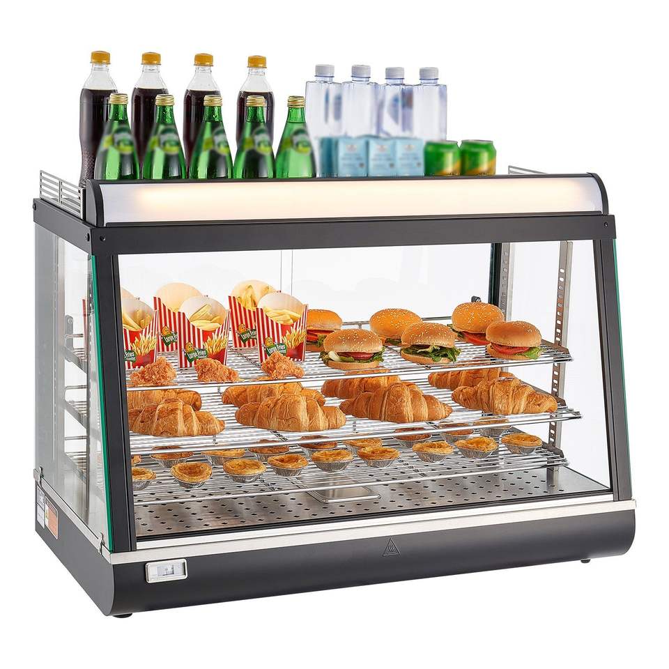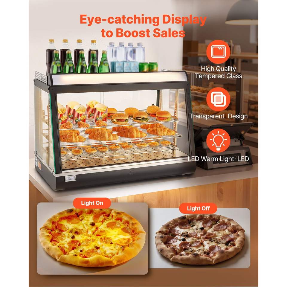 Espositore Riscaldato Commerciale a 3 Livelli 1400W con Luce LED, Vano Superiore e Ripiani Regolabili, Intervallo di Temperatura 86-185°F