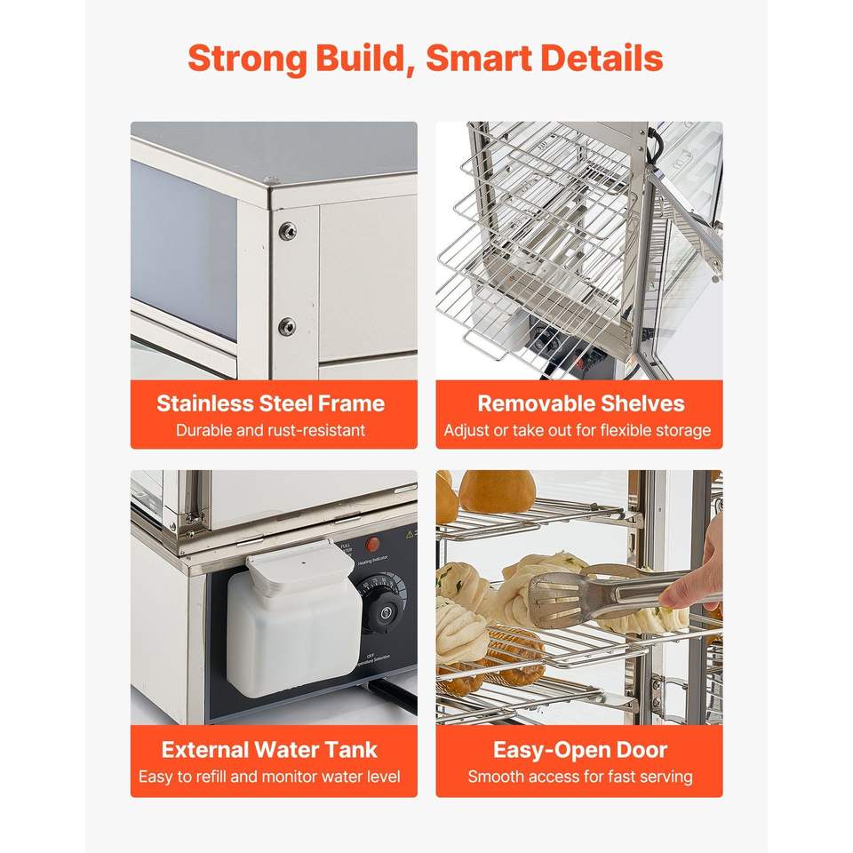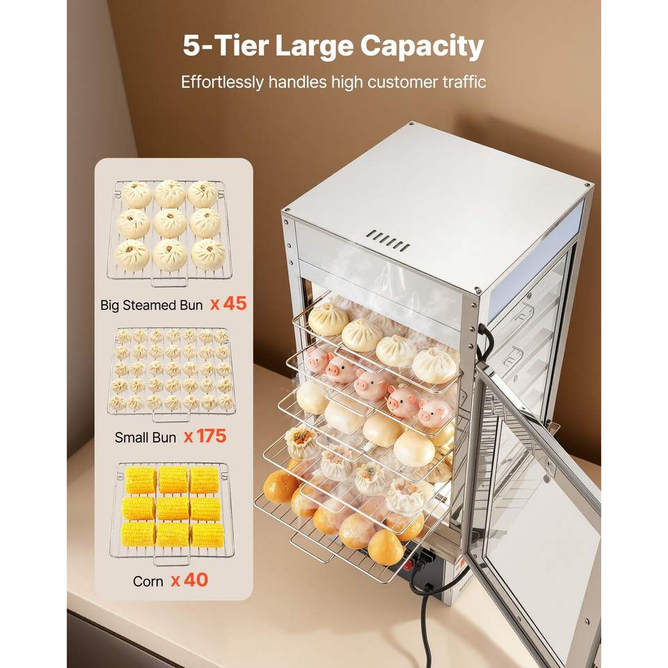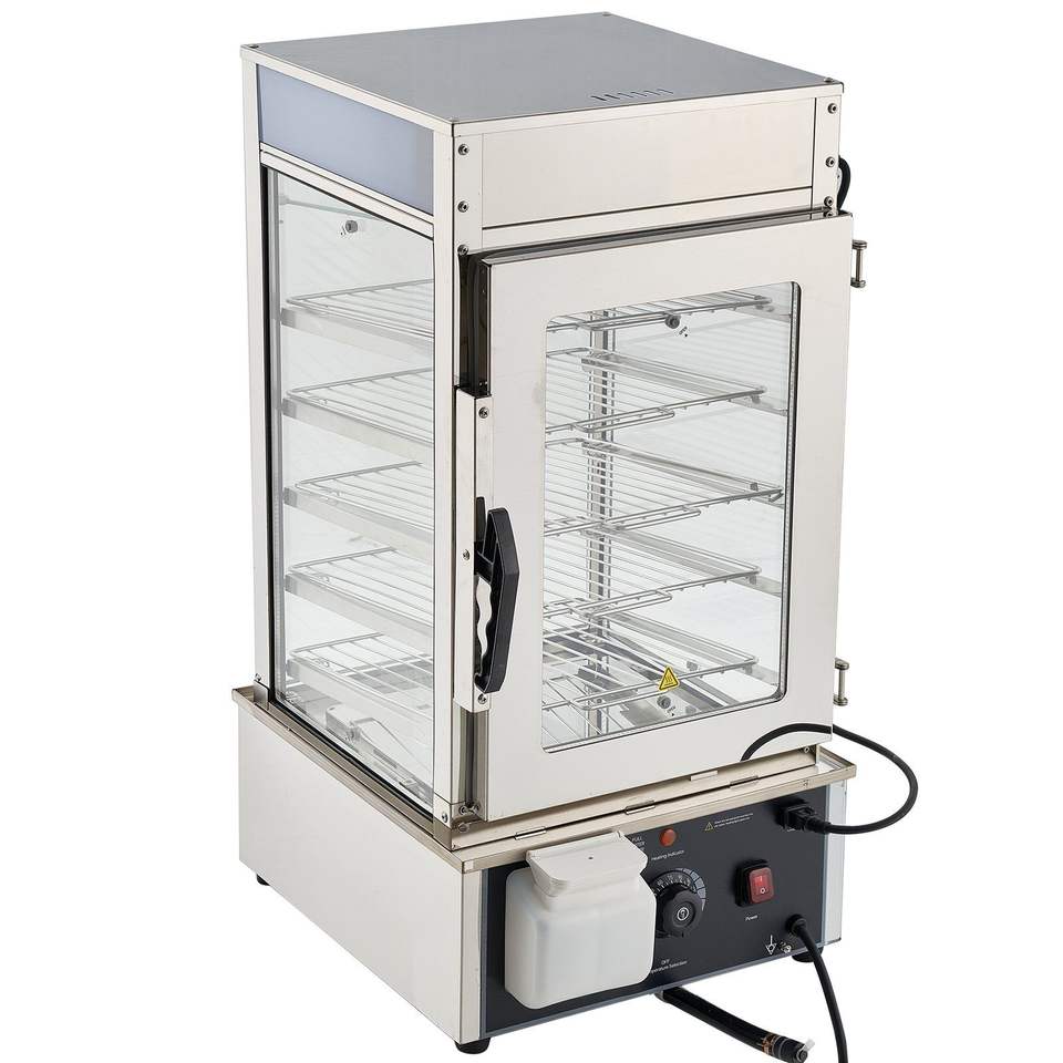 Espositore Riscaldato per Alimenti a 5 Ripiani in Acciaio Inox, 1200W, Luce LED, Ripiani Regolabili, 86 Pollici
