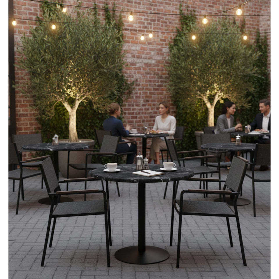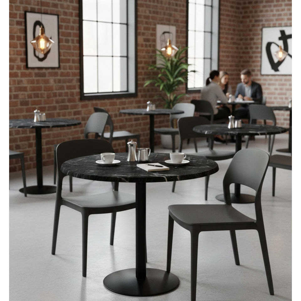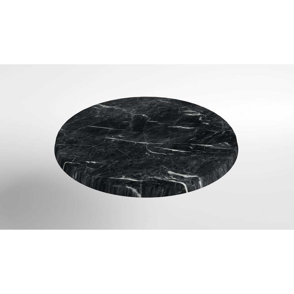 Tavolo Rotondo di Grado Commerciale Effetto Marmo Nero con Piano Rinforzato in Composito di Pietra per Uso Interno ed Esterno