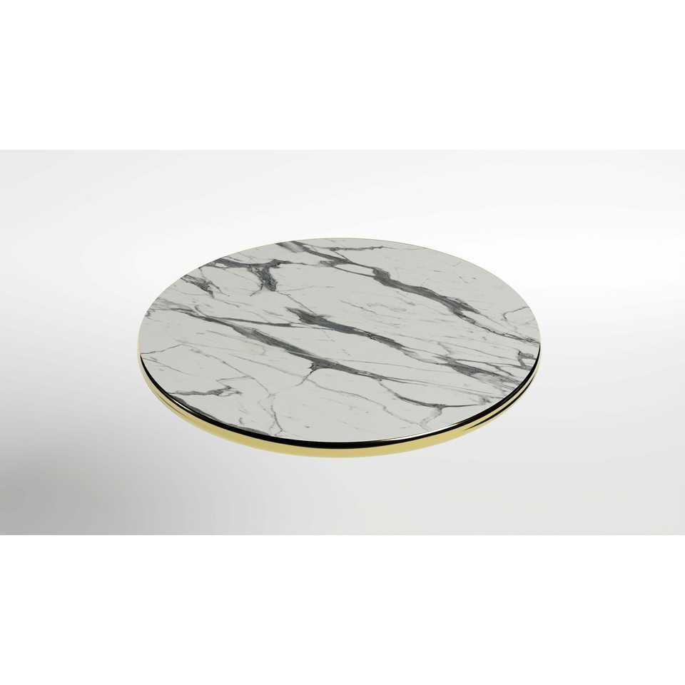 "Commercial-Grade Round White Marble-Like Table with Gold Trim Reinforced Stone-Composite Top for Indoor & Outdoor Use"
