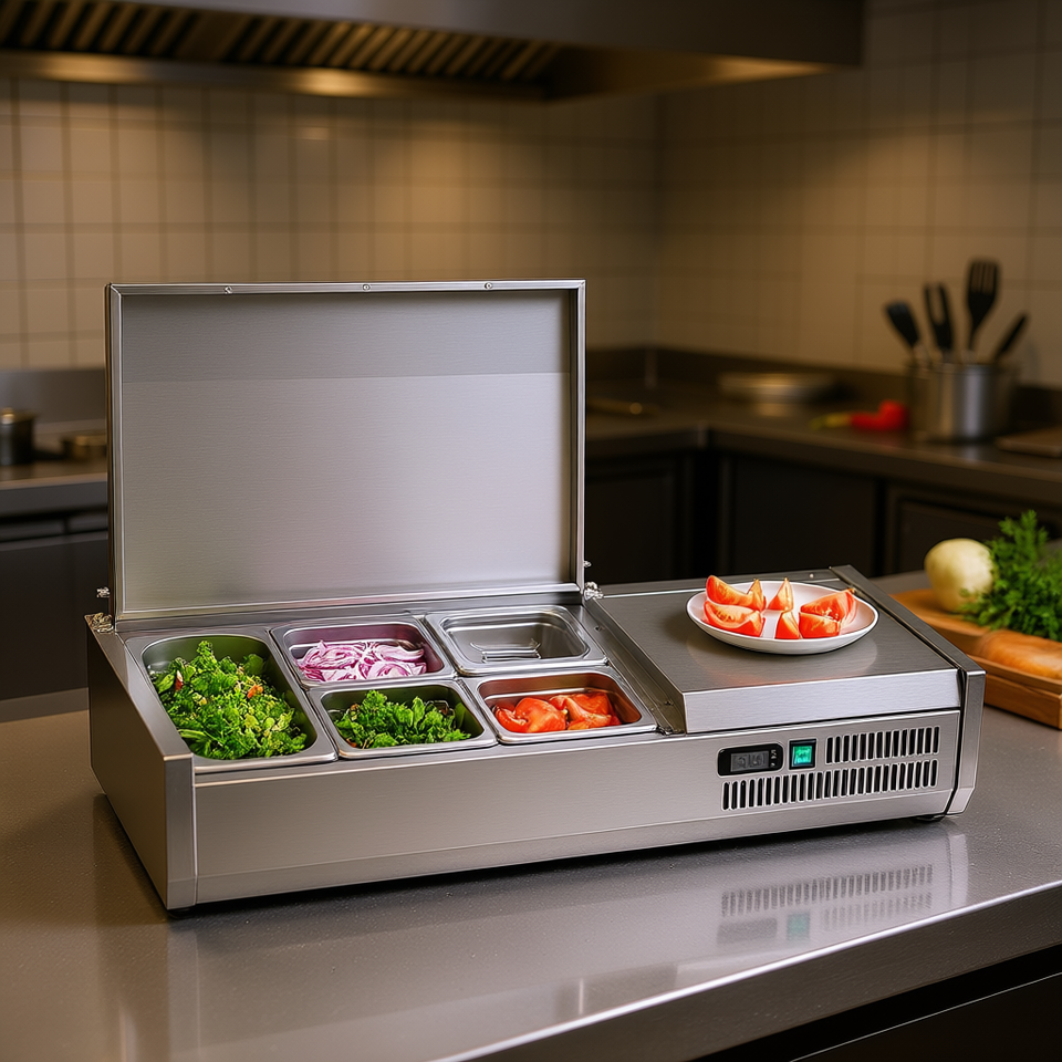 Stazione di Preparazione Condimenti Honker 130 W con 1 Vasca e 4 Vasche 1/6 in Acciaio Inox per Cucina Commerciale Refrigerata