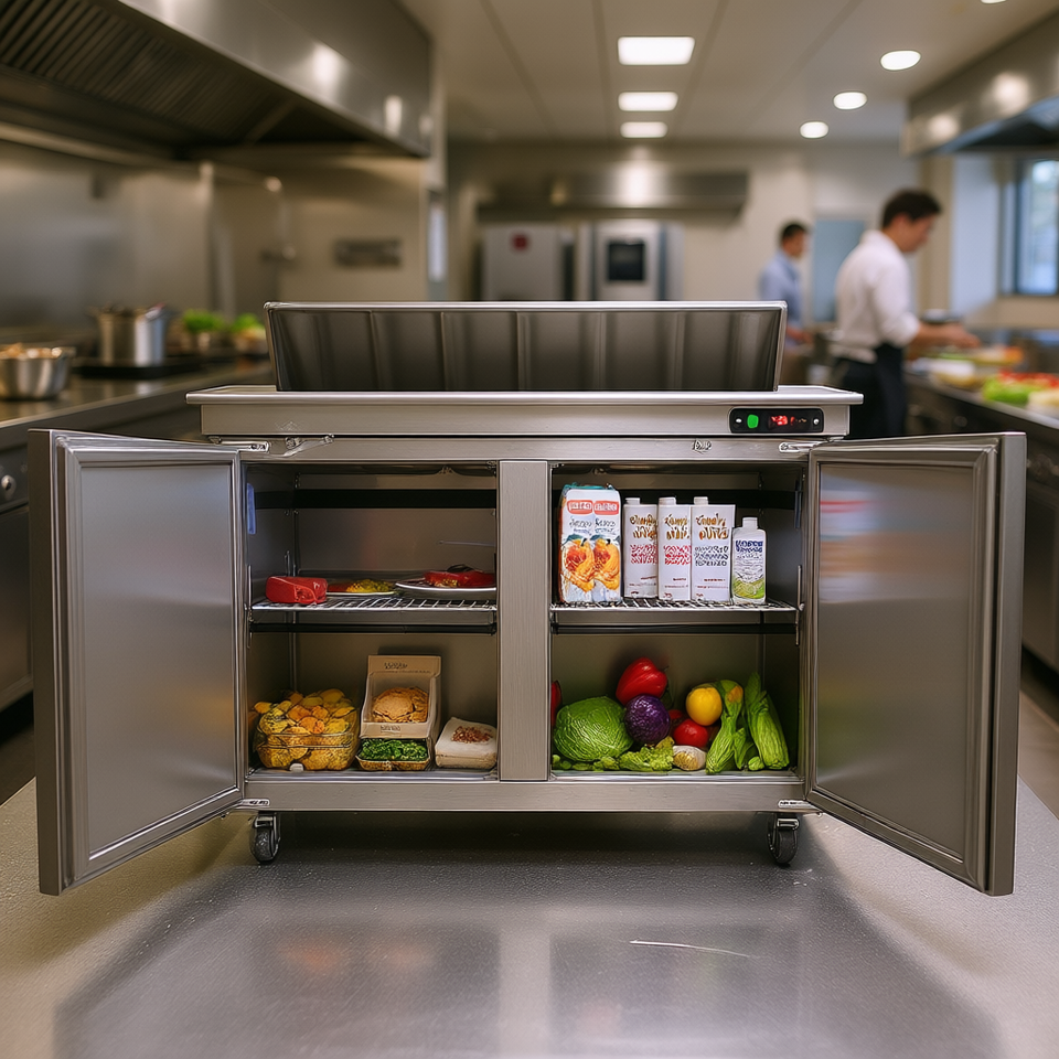 Commercial Refrigerated Food Prep Station 48 Inch Stainless Steel 2 Door 12.9 Cu Ft With Cutting Board And Pans