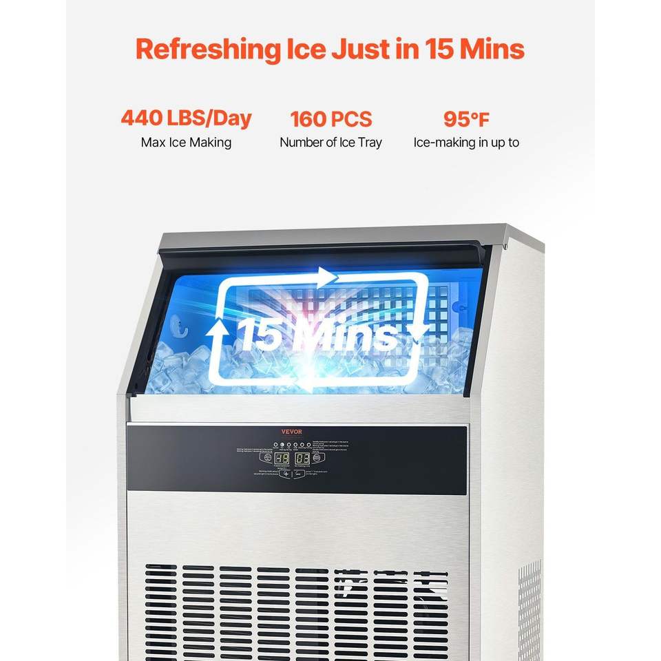 Macchina per il ghiaccio commerciale da cucina, autoportante, 440 libbre/24H, 160 cubetti di ghiaccio in 15 minuti, grande capacità 88 libbre