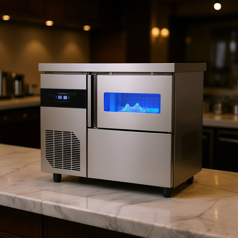 Macchina per il ghiaccio in acciaio inossidabile, produzione 132 libbre/24 ore, capacità di stoccaggio 30 libbre, 70 cubetti, a ciclo continuo, autoportante, per casa e bar