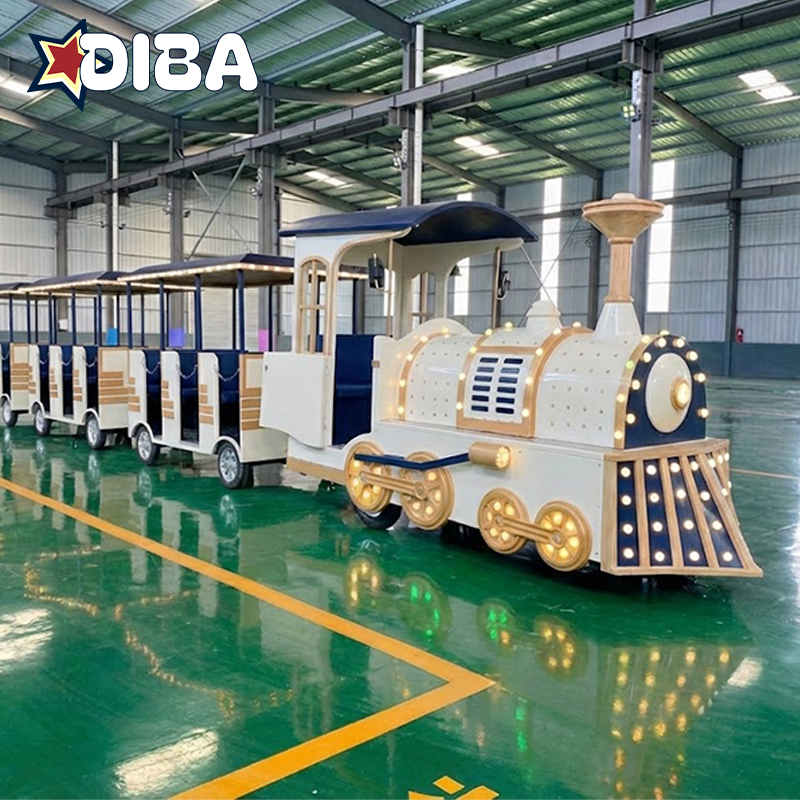 Treno per uso commerciale per parchi divertimento, struttura in ferro, trenino senza binari per centri commerciali e musei