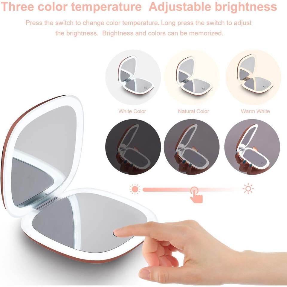 Specchio da Viaggio LED Compatto 4 Pollici con Ingrandimento 1X/10X, Illuminazione Bifacciale Dimmerabile, Ricarica USB