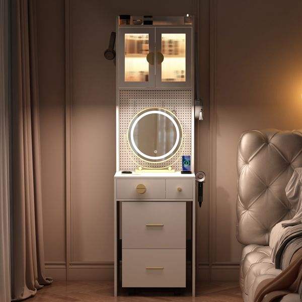 Compact Mini Corner Makeup Vanity Set LED Lights Charging Station Storage Drawers Shelves Hidden Storage Stool for Small Spaces