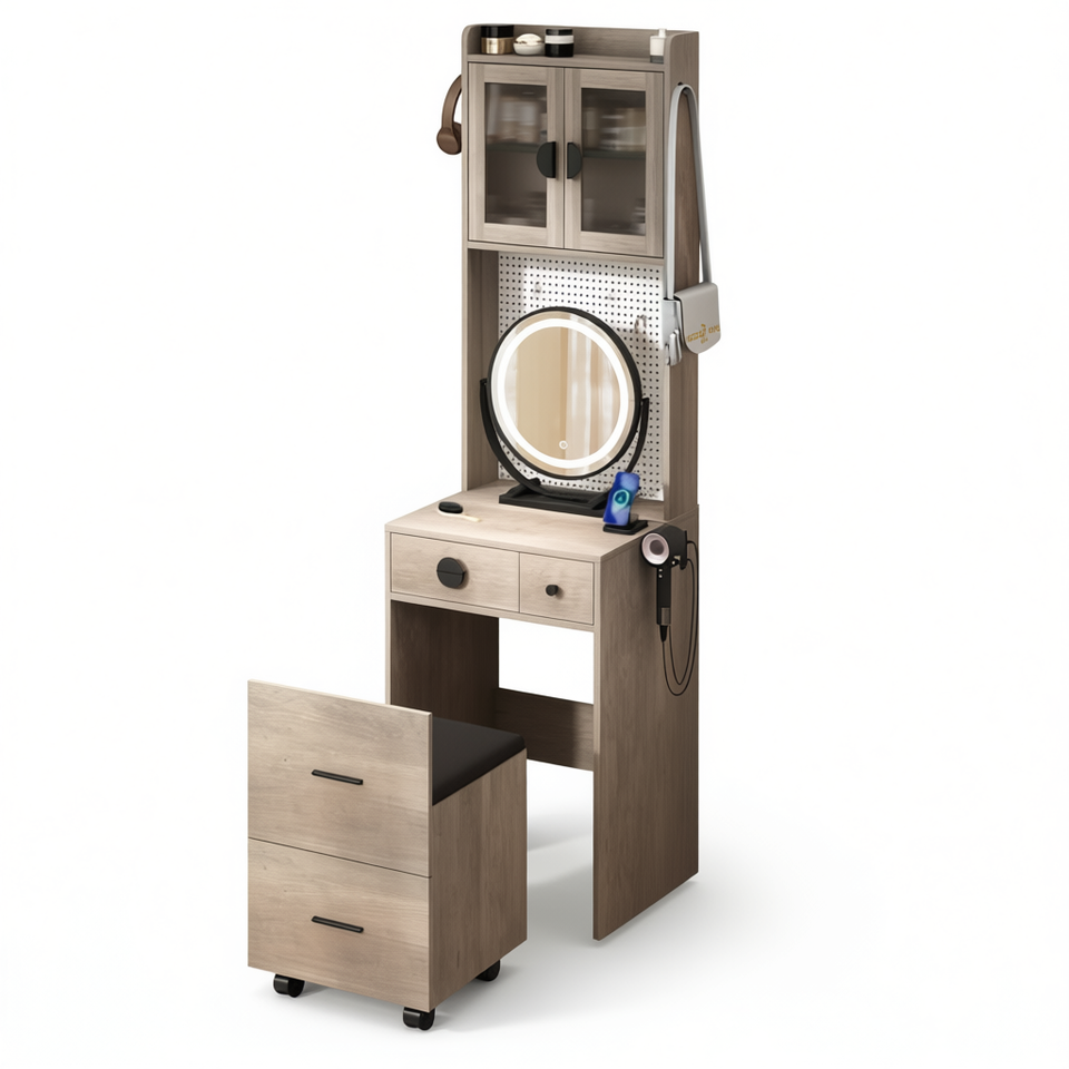 Set Compatto per Trucco con Specchio, Luci LED, Cassetti e Sgabello per Piccoli Spazi, Design Moderno