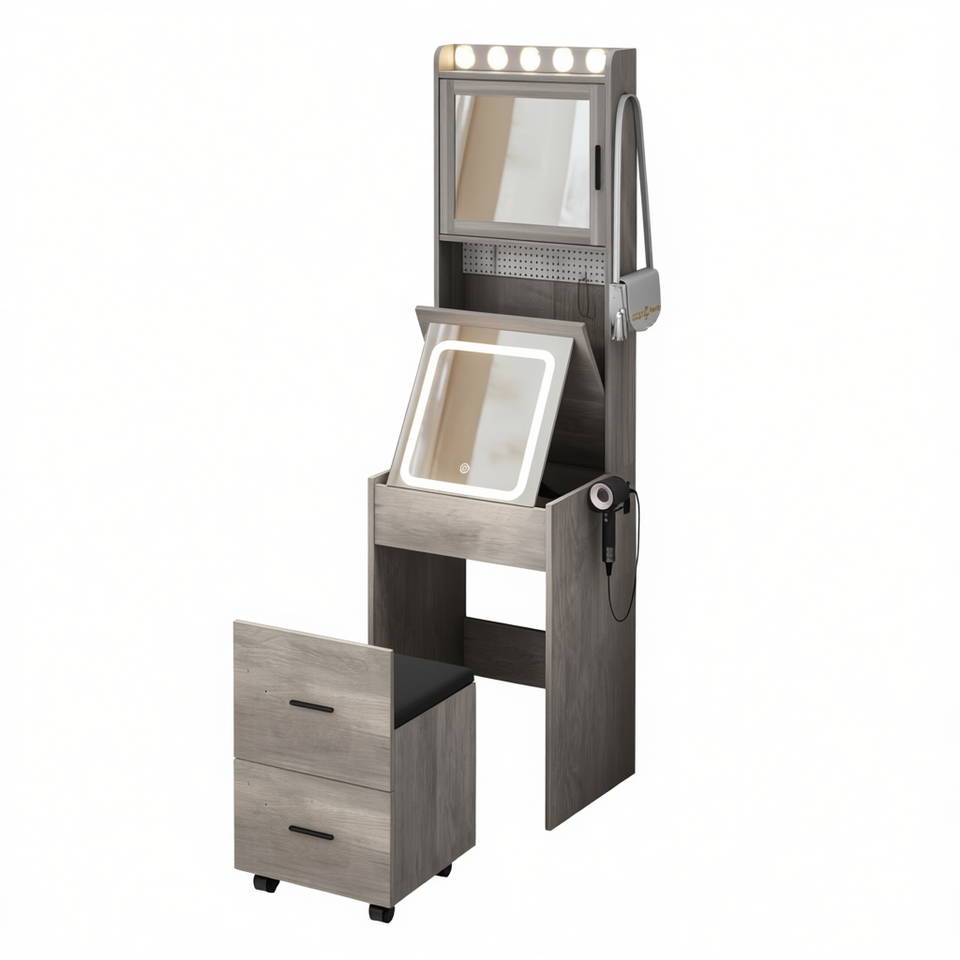 Set Vanity Compatto Grigio con Luci LED, Sgabello Contenitore, Postazione Trucco, Design Moderno, Arredamento Camera da Letto