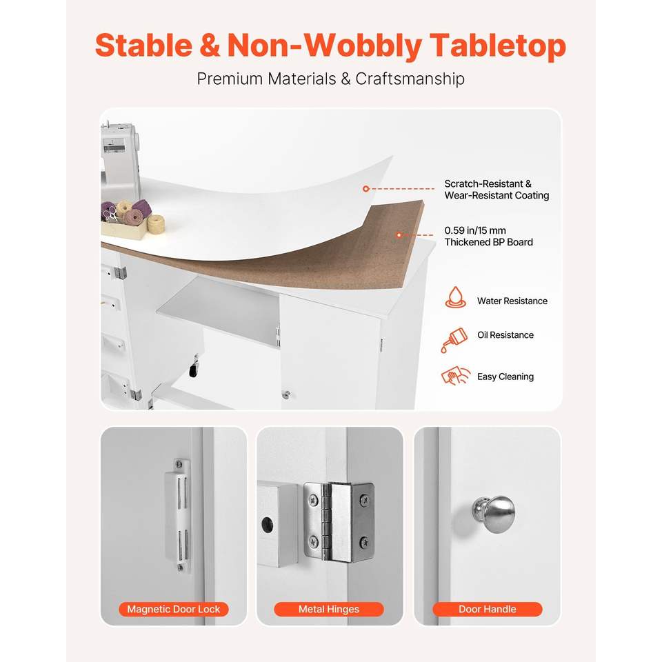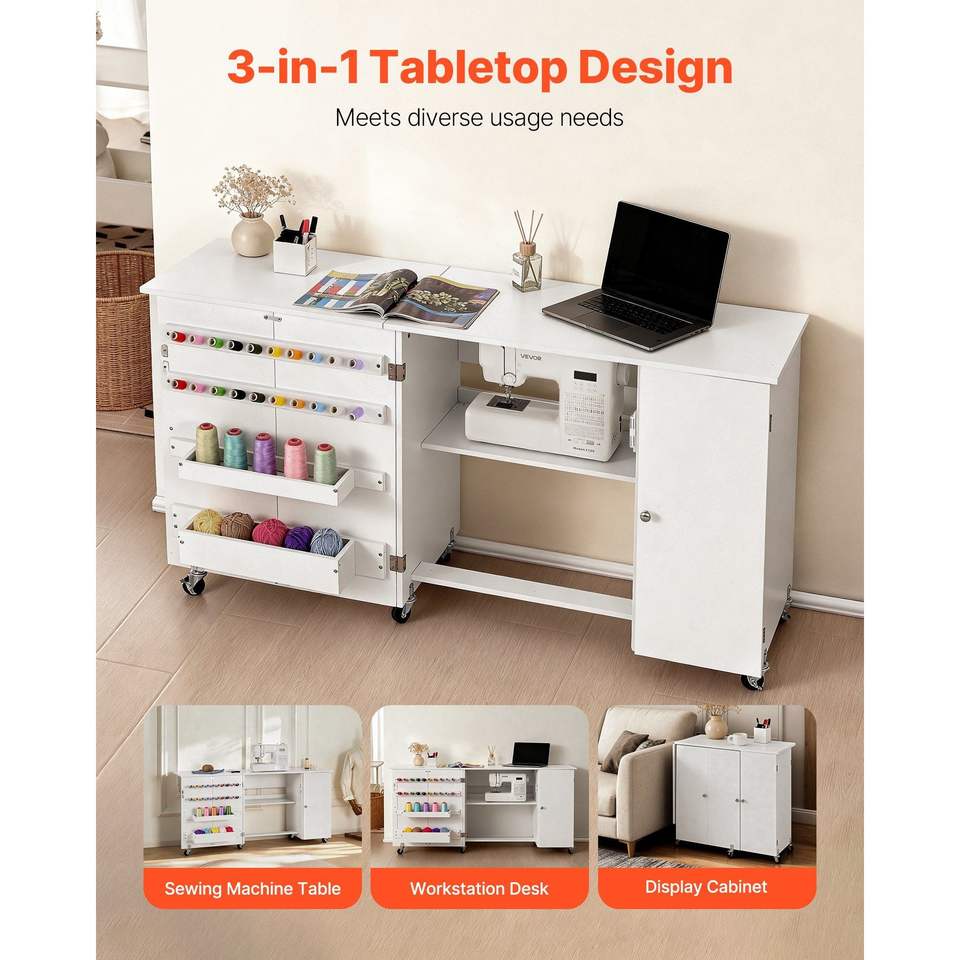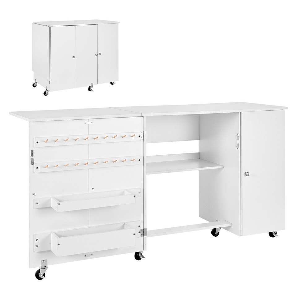 Tavolo Compatto Multifunzione per Macchina da Cucire con Ganci in Legno Pieghevoli e Vassoi Portaoggetti con Ruote - Scrivania da Ufficio