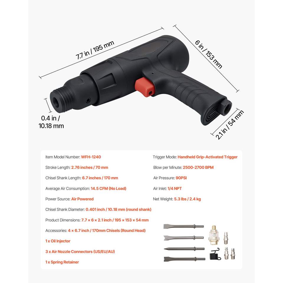 Martello Pneumatico Compatto con Impugnatura a Pistola, 2500-2700 BPM, Corsa da 2,76 Pollici, con 4 Scalpelli a Canna Lunga 6,7 Pollici, Trapano a Percussione Pneumatico
