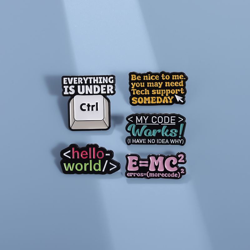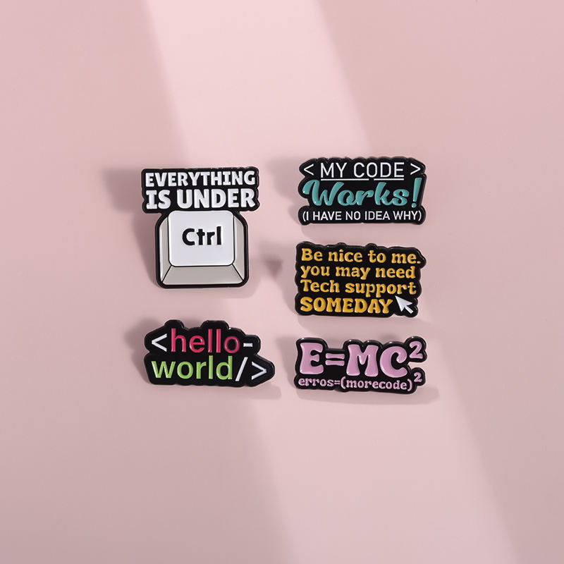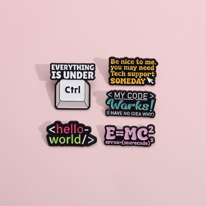 QIHE Spilla smaltata "Hello World" in lega di zinco, placcatura nichel nero, logo personalizzabile, tema codice informatico, origine Zhejiang, Cina
