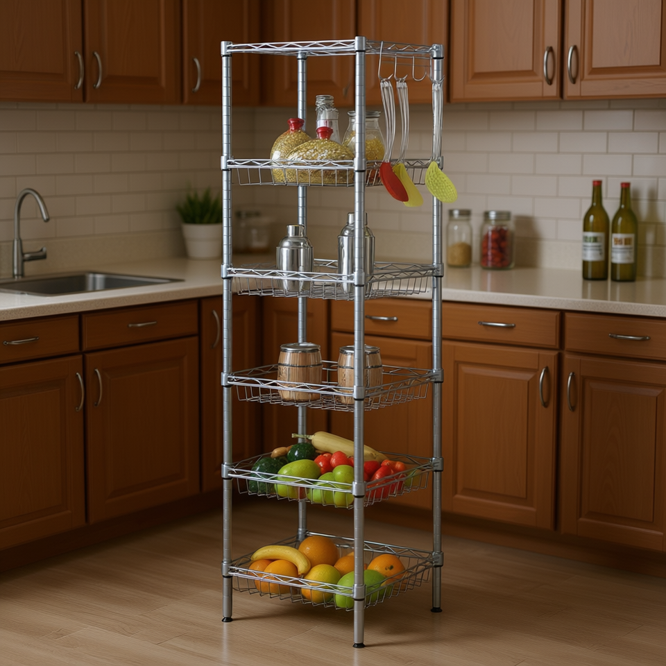 Scaffale portaoggetti a 6 ripiani in acciaio al carbonio, design minimalista autoportante per l'organizzazione della cucina