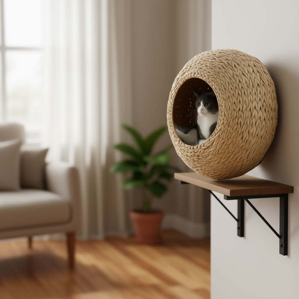 Woven Cat Shelf Bed Round Fiber Pet Bed Indoor Minimalist Style All Seasons No Assembly Required