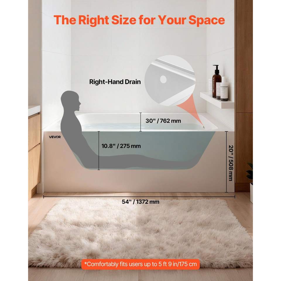 Vasca da bagno contemporanea in acrilico da incasso 54'' x 30'' con scarico a destra e foro di troppopieno, grande, 30'' contemporanea in acrilico da incasso
