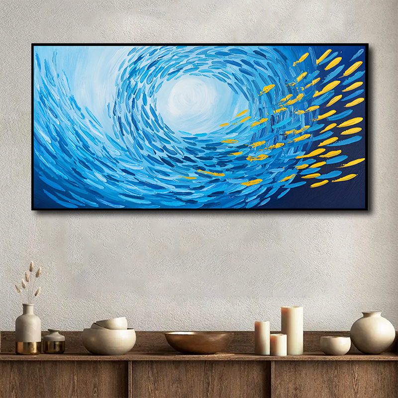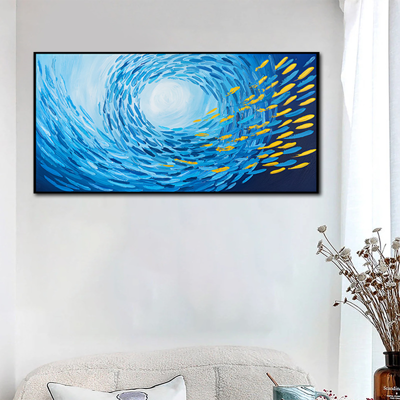 Pesce dorato blu contemporaneo dipinto a mano pittura a olio su tela grande arte oceano mare pittura a olio profonda decorazione per la casa