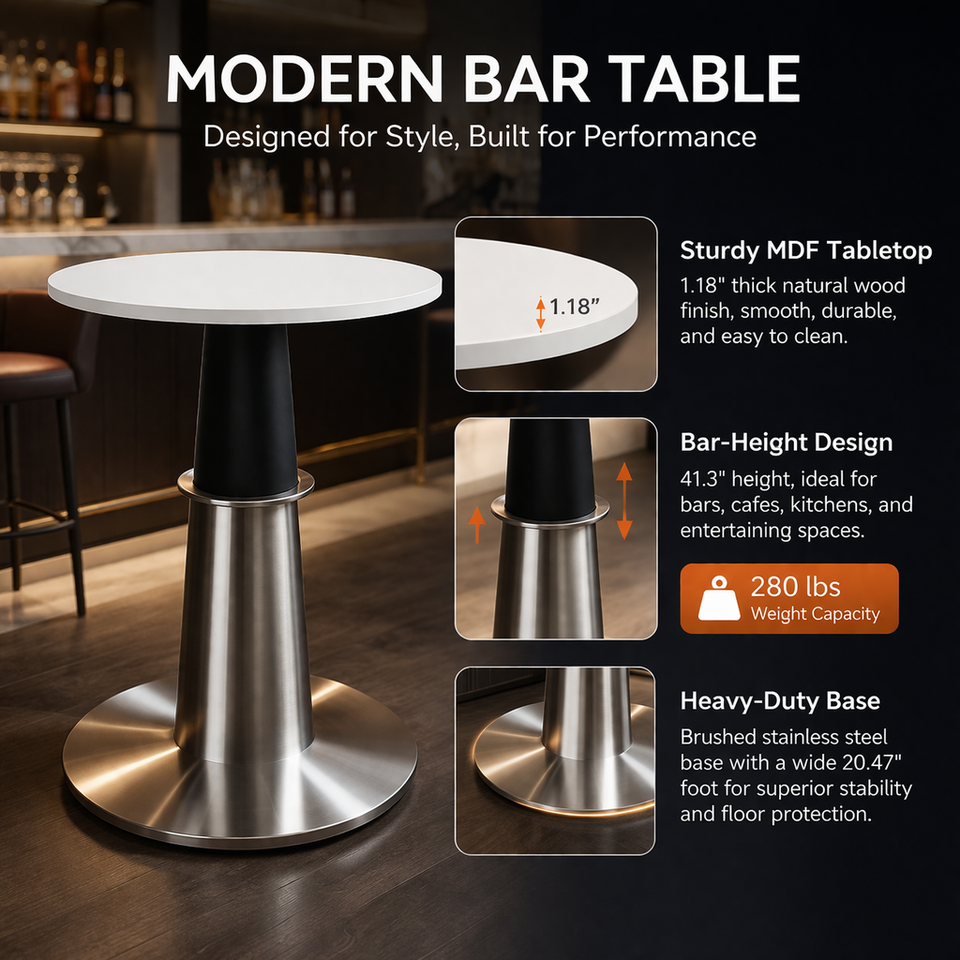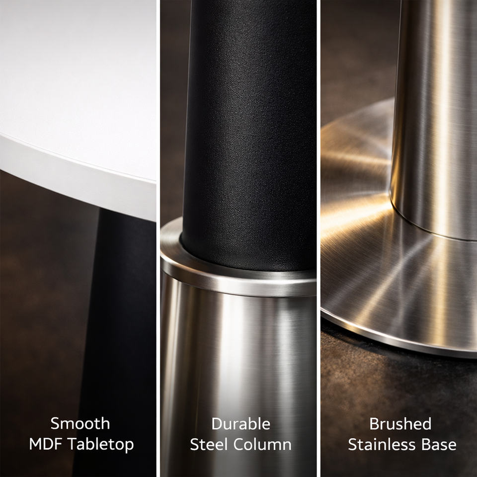 Tavolo da Cocktail Contemporaneo con Base a Piedistallo in Acciaio Inossidabile e Piano Rotondo Bianco per Uso in Caffè, Hotel, Lounge e Ristoranti